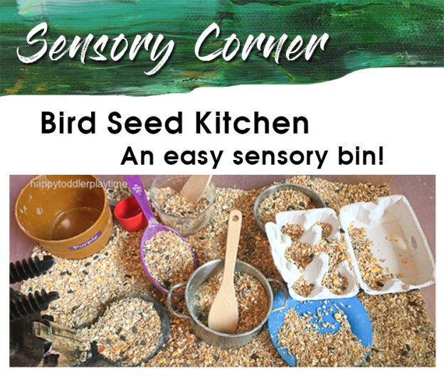 Bird seed is a great indoor or outdoor sensory bin filler. Outdoors in your mud kitchen, spills will just provide the birds an extra snack. Other great ideas include adding gardening tools and flowers or mini birds, nests and rocks.