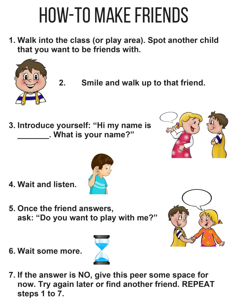 Here is one scenario on the HOW-TO make friends. Tell your child to: