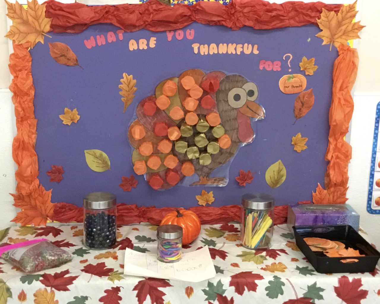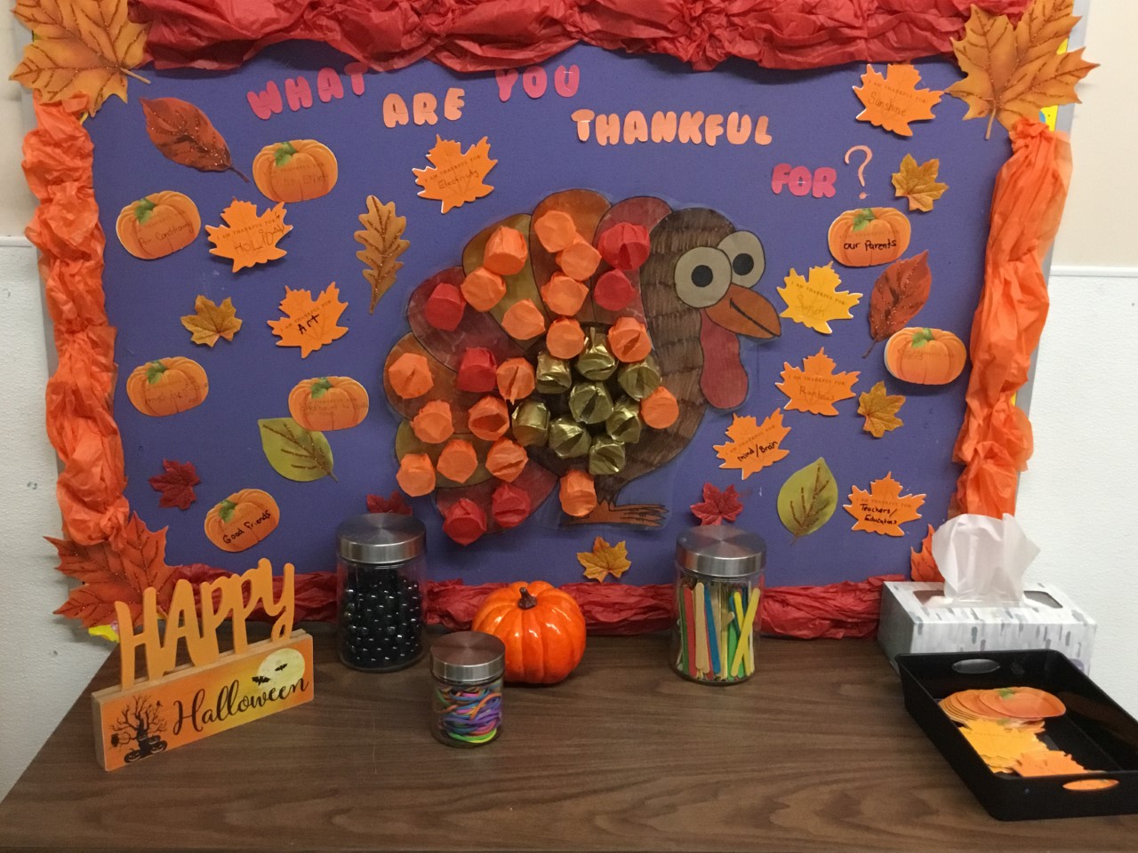 For the month of October to celebrate Thanksgiving, we had 31 days of thankfulness. We used 31 small cups (plastic shot glasses) that we covered in tissue paper and each cup had something to be thankful for inside. Ms. Davis drew a turkey so we could stick the cups on it for the month. Each day we poked a cup and discussed what word was in the cup and why we were each personally thankful for it.