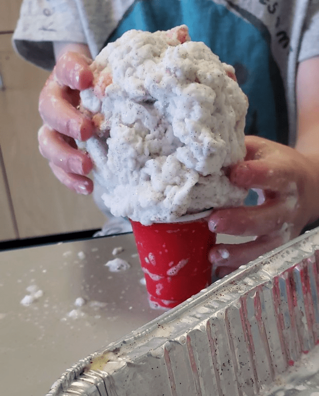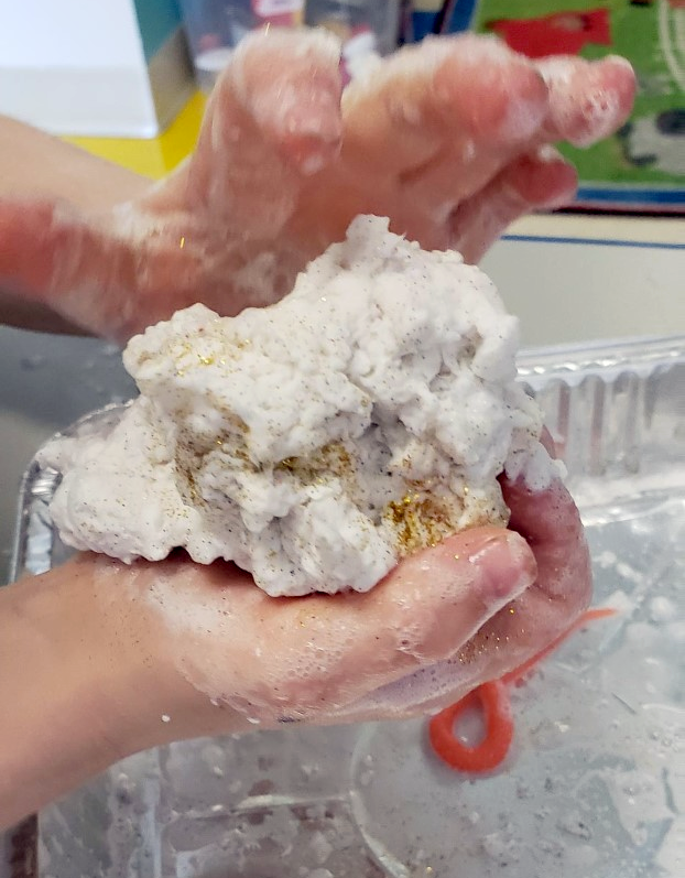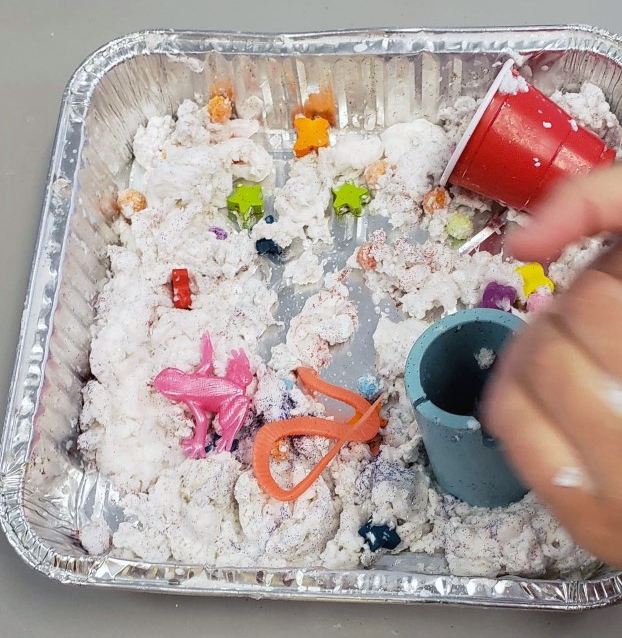 Clean mud is a great sensory activity for all age groups. Recipes can be adapted to desired consistency and many items can be added to this activity to make it more interactive. Other great ideas include adding, sparkles, pom poms, animals, Duplo, plastic or stretchy bugs, spoons and cups etc. This school age group, made the clean mud themselves and kept their bins for a week so each child could add to it and use as desired.