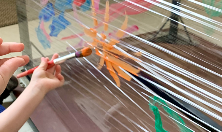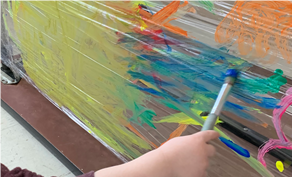 Upon setup, the children quickly became inquisitive and were thrilled to use their imaginations to create a mosaic of colour on the saran wrap. They chatted amongst themselves about their creations and shared their colours. The younger children enjoyed brushing different colours on the saran, while the older ones drew images and explained what they were painting.