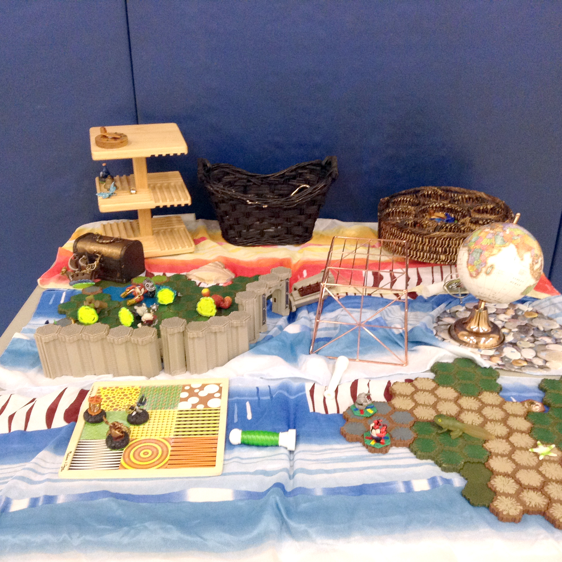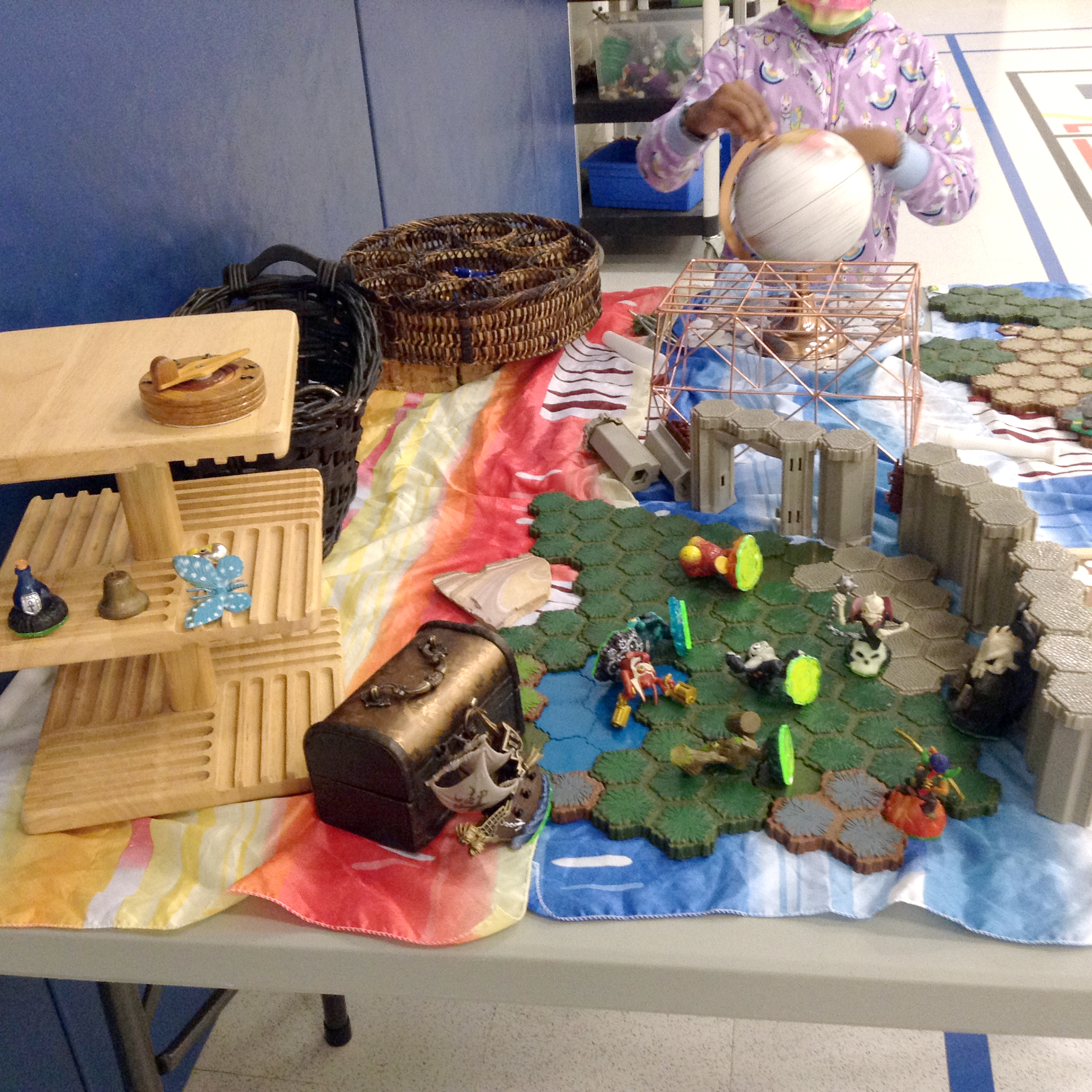 Children in this school age program create small world play using various pieces from baskets. The themes change but the concept is similar, using small loose parts to create different small worlds in their shared space in the gym. How do you use loose parts in your school age program?