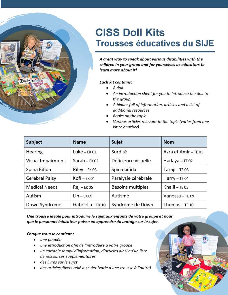 Did you know CISS has doll kits available to borrow and share in your program? The kits include information on specific disabilities including: articles, children’s books, videos and tips sheets, as well as, a fantastic doll with accessories for the children to play with and enjoy.