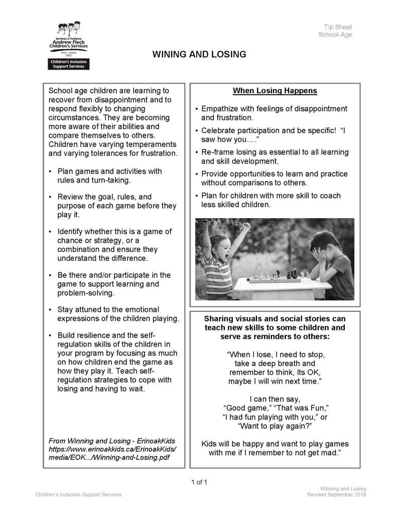 School age children are learning to recover from disappointment and to respond flexibly to changing circumstances. They are becoming more aware of their abilities and compare themselves to others. Children have varying temperaments and varying tolerances for frustration.